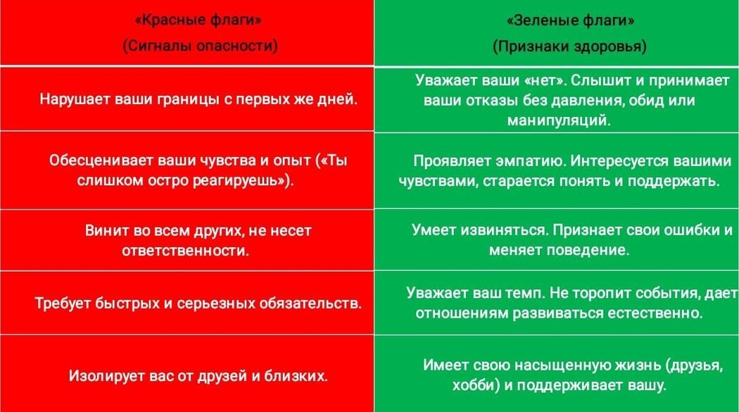 После опыта травмы легко стать слишком настороженным и сосредоточиться исключительно на "красных флагах" — признаках опасности. Однако для комфортного и здорового партнерства стоит учиться замечать «зеленые флаги» — знаки психологической зрелости. Вместо нытья о границах, стоит обратить внимание на их уважение. Человек, который слышит ваше "нет", и откликается на ваши чувства, — это настоящий признак безопасности.