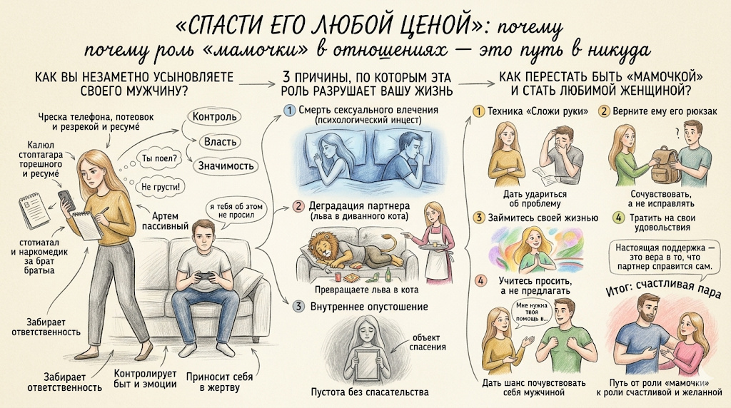 Роль «матери» в отношениях необычайно коварна. Она дарит женщине иллюзорию власти и значимости, однако в конечном итоге расплачивается за эту власть через разрушение женственности и притупление эмоций.