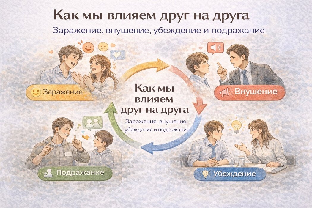 Общение — это гораздо больше, чем просто слова. Каждый раз, когда люди взаимодействуют, они непроизвольно воздействуют друг на друга. В социальной психологии выделяются значимые механизмы этого влияния: эмоциональное заражение, внушение, убеждение и подражание. Давайте подробнее рассмотрим, как эти процессы работают в нашем повседневном опыте.