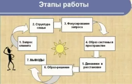 Процесс продолжается уточнением запроса. Этот этап является ключевым, ведь от качества формулировки вопроса зависит направление всей работы. Запрос должен быть сосредоточен на ощущениях самого клиента, а не на других людях. Например, вместо вопроса «что делать с внучкой?» следует задать «что я чувствую по отношению к внучке и почему мне трудно с ней общаться?» Далее терапевт собирает информацию о семейной истории, значительных событиях и потерях, используя геносоциограмму — «карту семьи», где обозначаются важные фигуры.