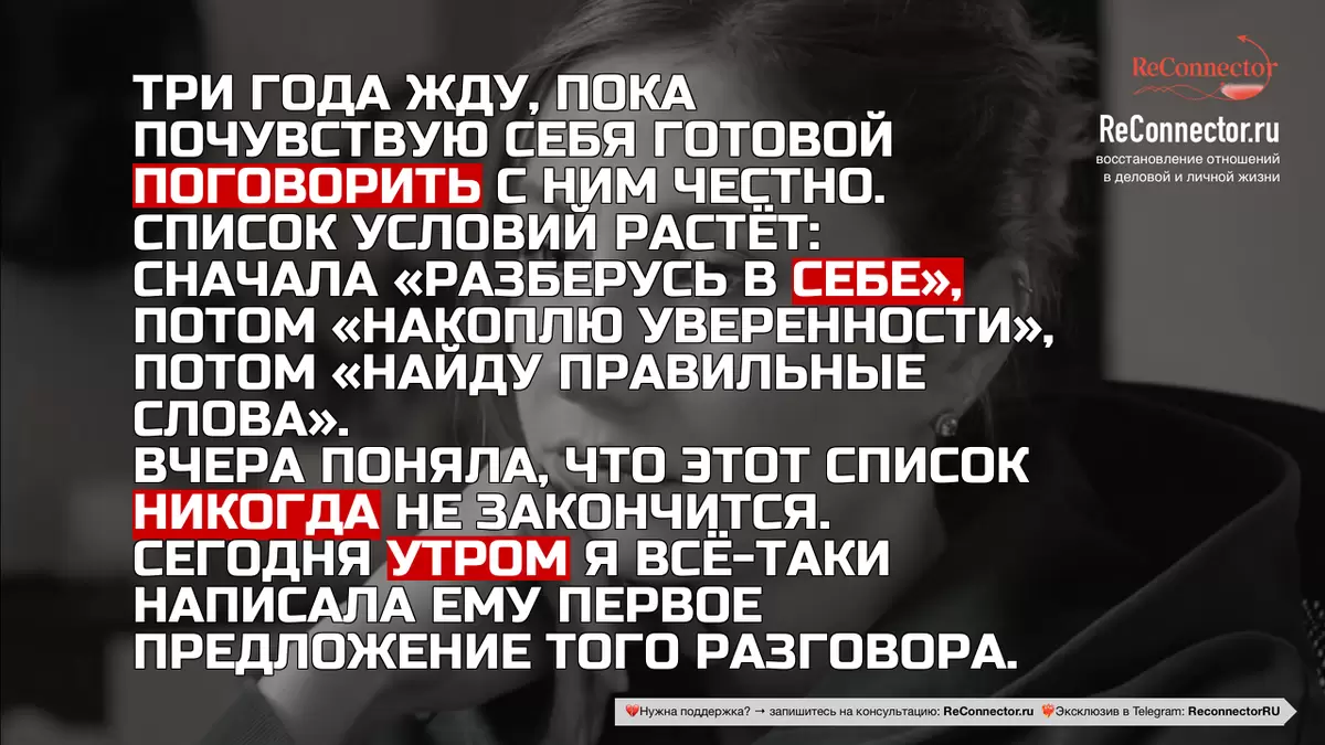 Стоит отметить, что страх не исчезает до тех пор, пока не произойдёт действие — он уходит лишь во время его совершения. Люди, решившиеся изменить свои отношения — как с партнёром, так и с самим собой — не ждут благоприятного момента.